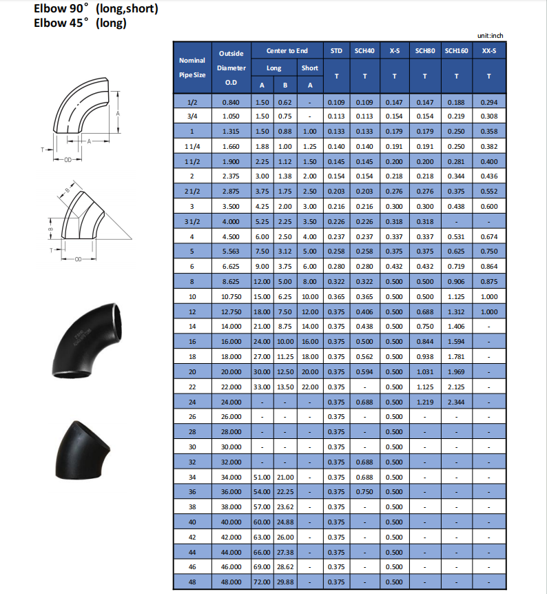 Size Table for Butt-Welded Elbows