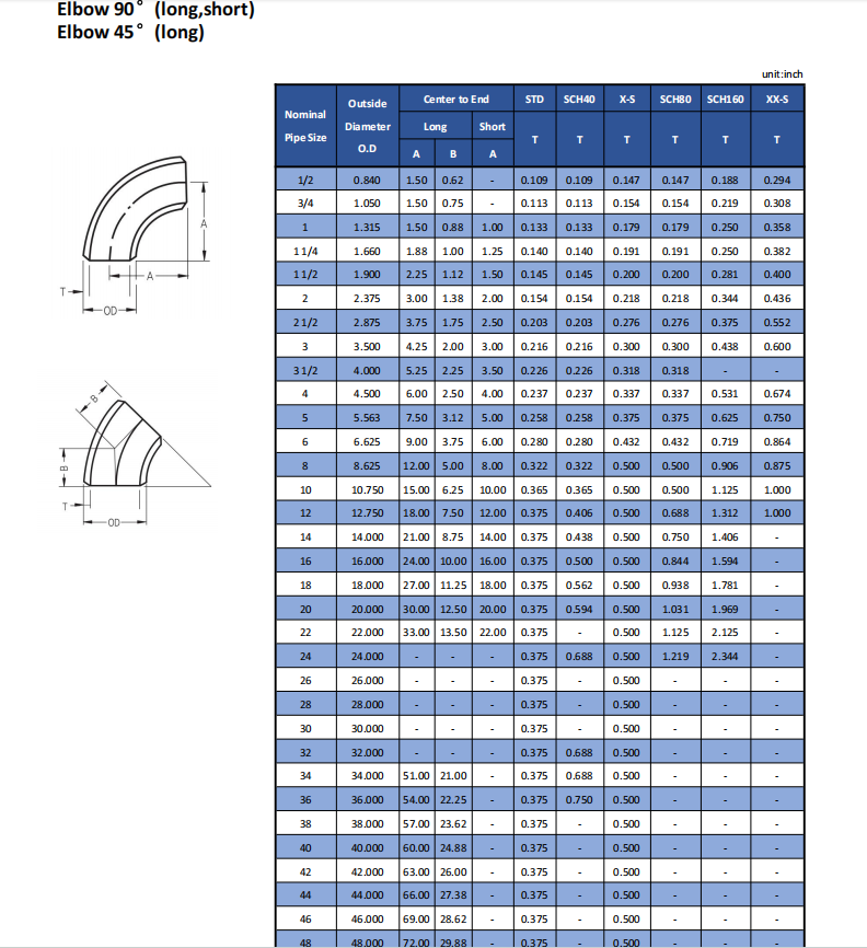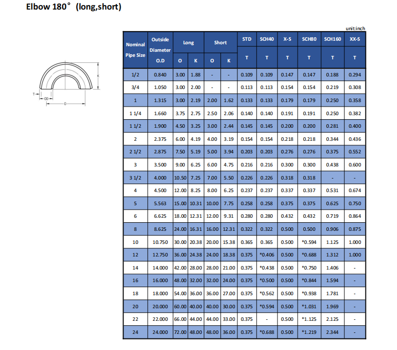 | Thickness Schedule | SCH 10, 20, 40, STD, XS, 80, 100, 120, 140, 160, XXS |